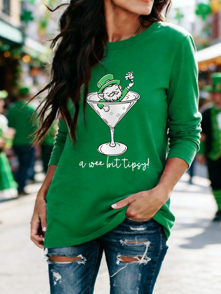 Women's Funny St Patrick's Day A Wee Bit Tipsy! Shamrock Print Casual Long Sleeve T-Shirt