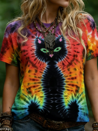 Women's Hippie Abstract Cat Tie-dye Pattern Casual T-shirt