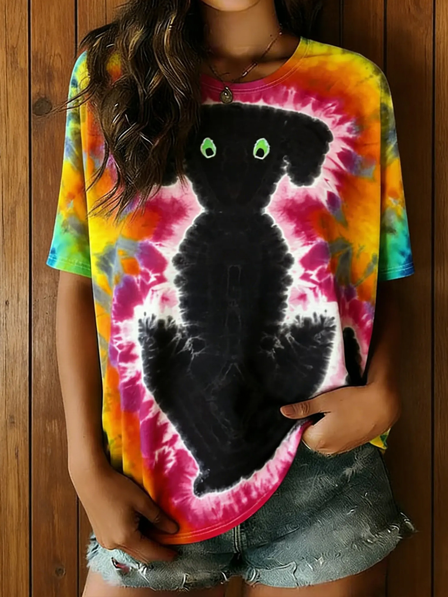 Women's Hippie Abstract Dog Tie-dye Pattern Casual T-shirt