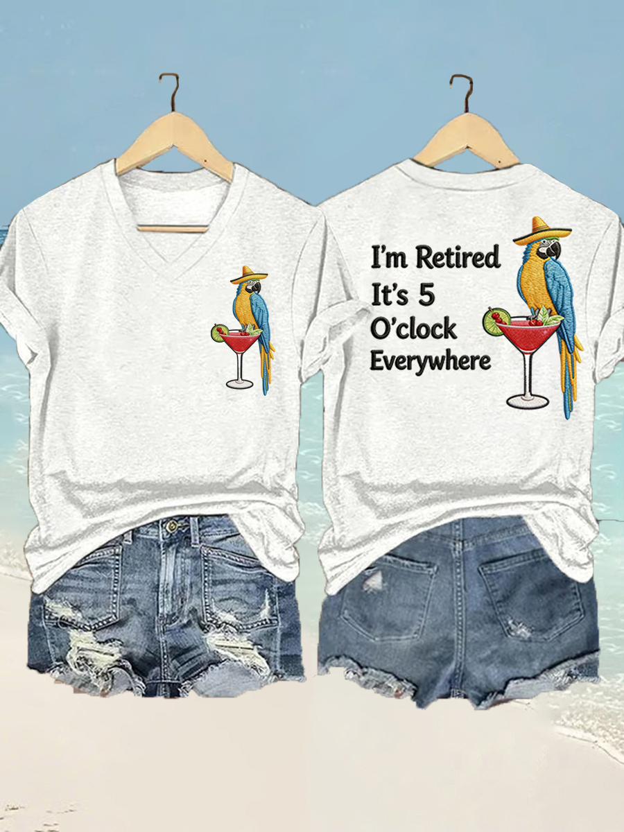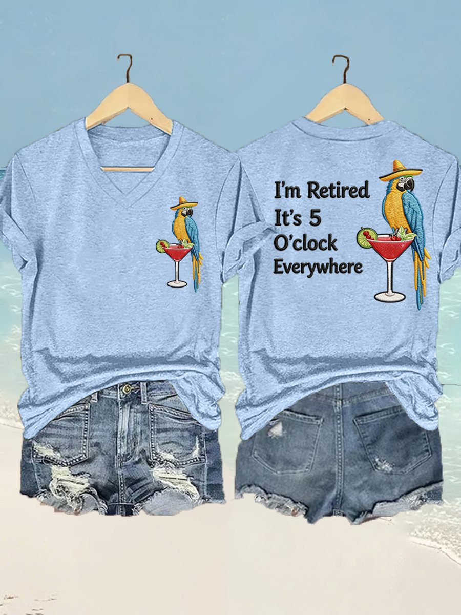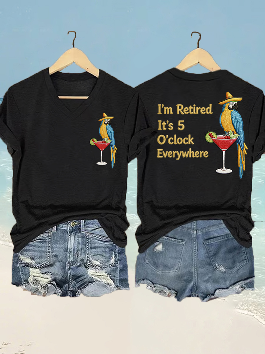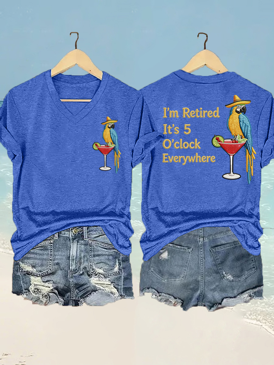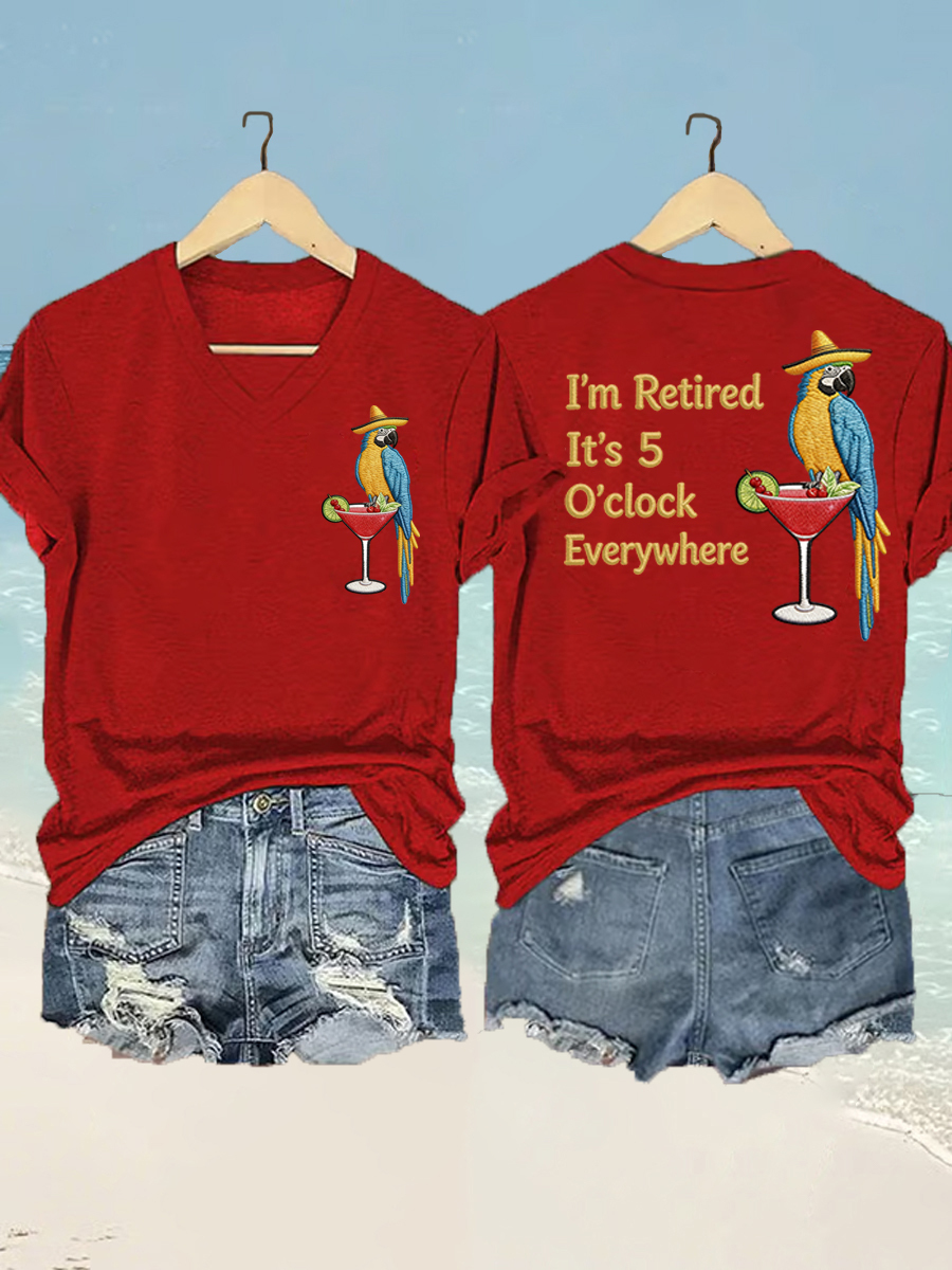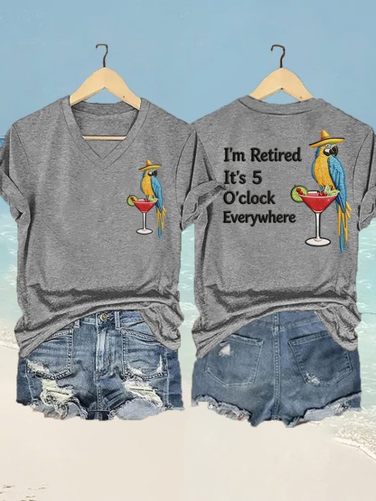 Women's I'm Retired It's 5 O'clock Everywhere Parrot Print Casual V-Neck Tee