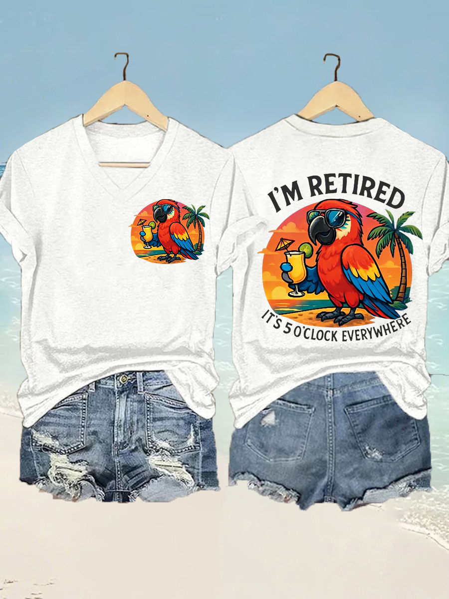 Women's I'm Retired It's 5 O'clock Everywhere Parrot Print Casual V-Neck Tee