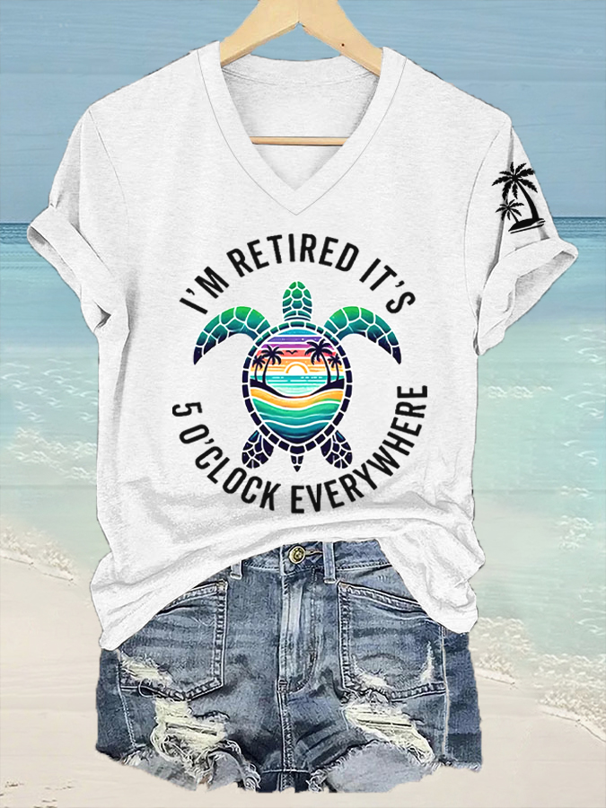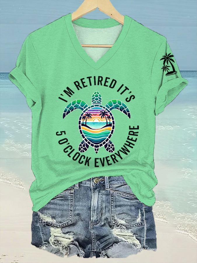 Women's I'm Retired It's 5 O'clock Everywhere Sea Turtle Print Casual V-Neck Tee