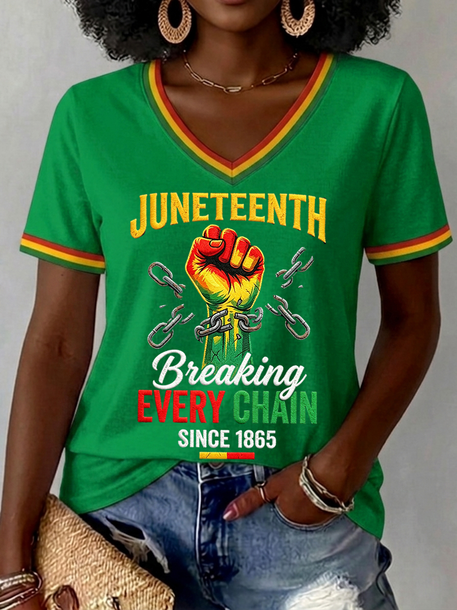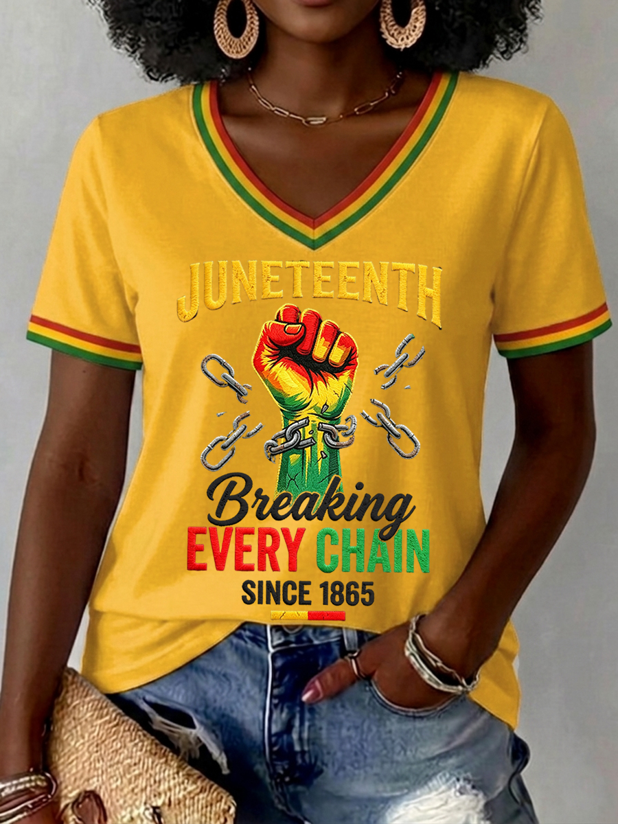 Women's Juneteenth Breaking Every Chain Since 1865 Print Casual V-Neck Tee