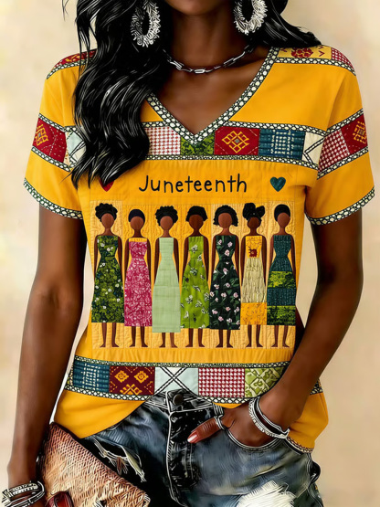 Women's Juneteenth Print Casual V-Neck Tee