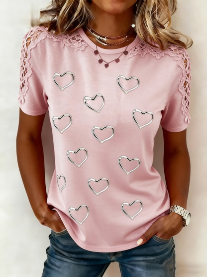 Women's Lace-Paneled Love Heart Print Casual Tee