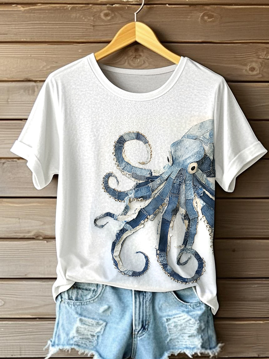 Women's Octopus Pattern Patchwork Art T-Shirt