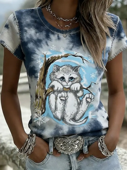 Women's Opalite Kitten In Tree With Tie Dye Art Short-sleeved T-shirt
