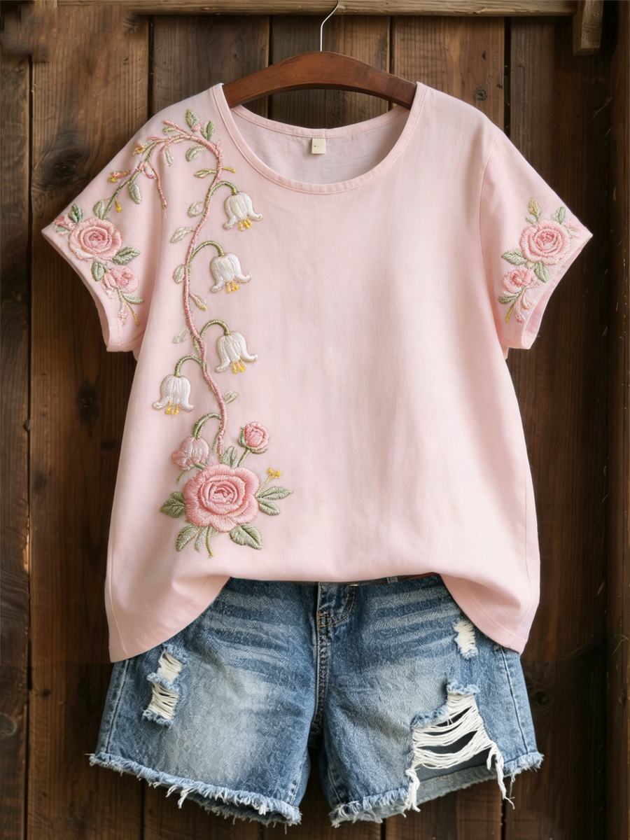Women's Pink Floral Print linen short-sleeved T-shirt