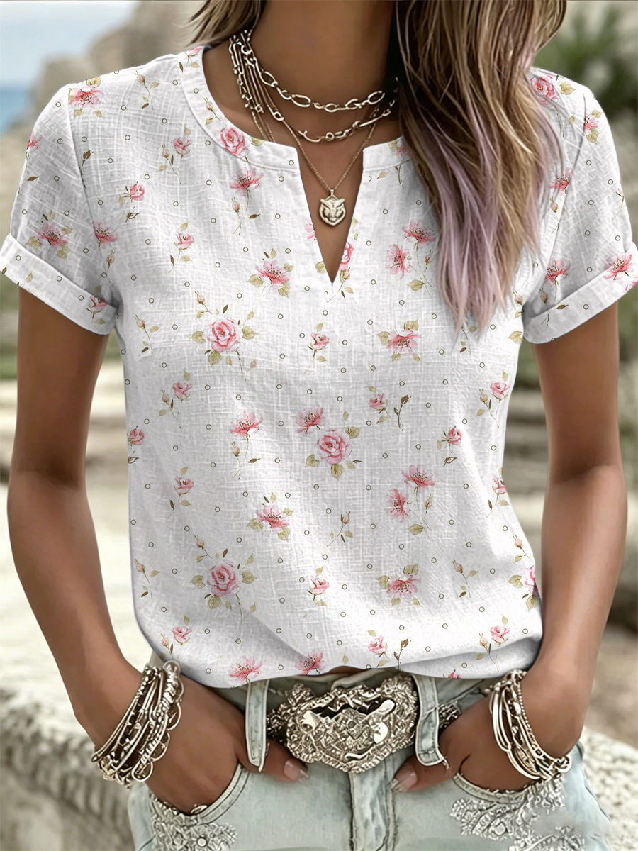 Women's Pink Flowers Print V-Neck Casual T-Shirt