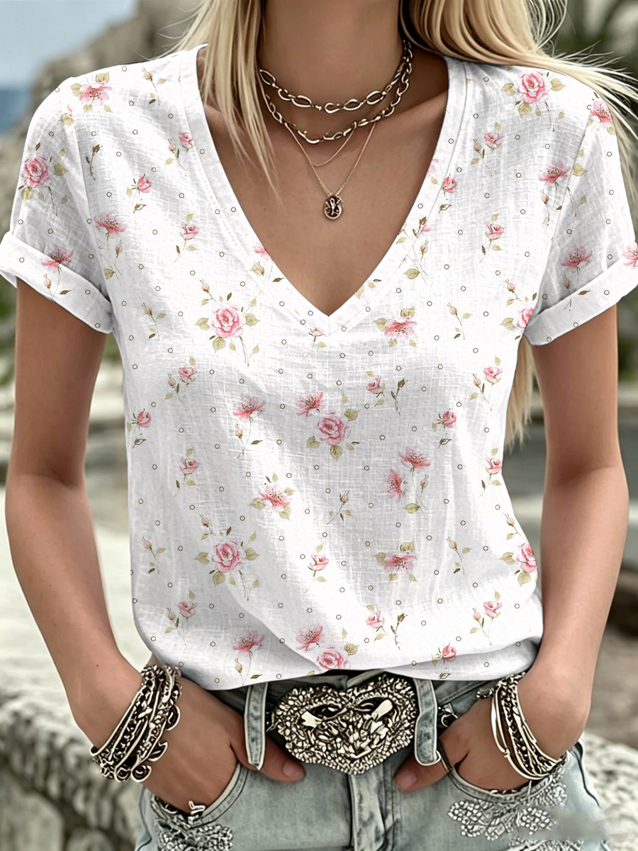 Women's Pink Flowers Print V-Neck Casual T-Shirt