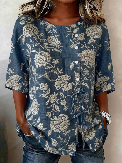 Women's Plants And Flowers Buttoned And Laced Linen Blend Shirt