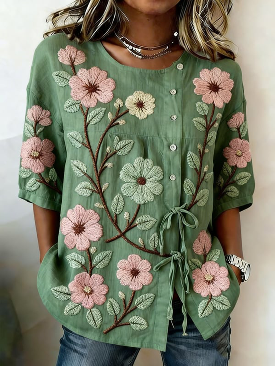 Women's Plants And Flowers Buttoned And Laced Linen Blend Shirt