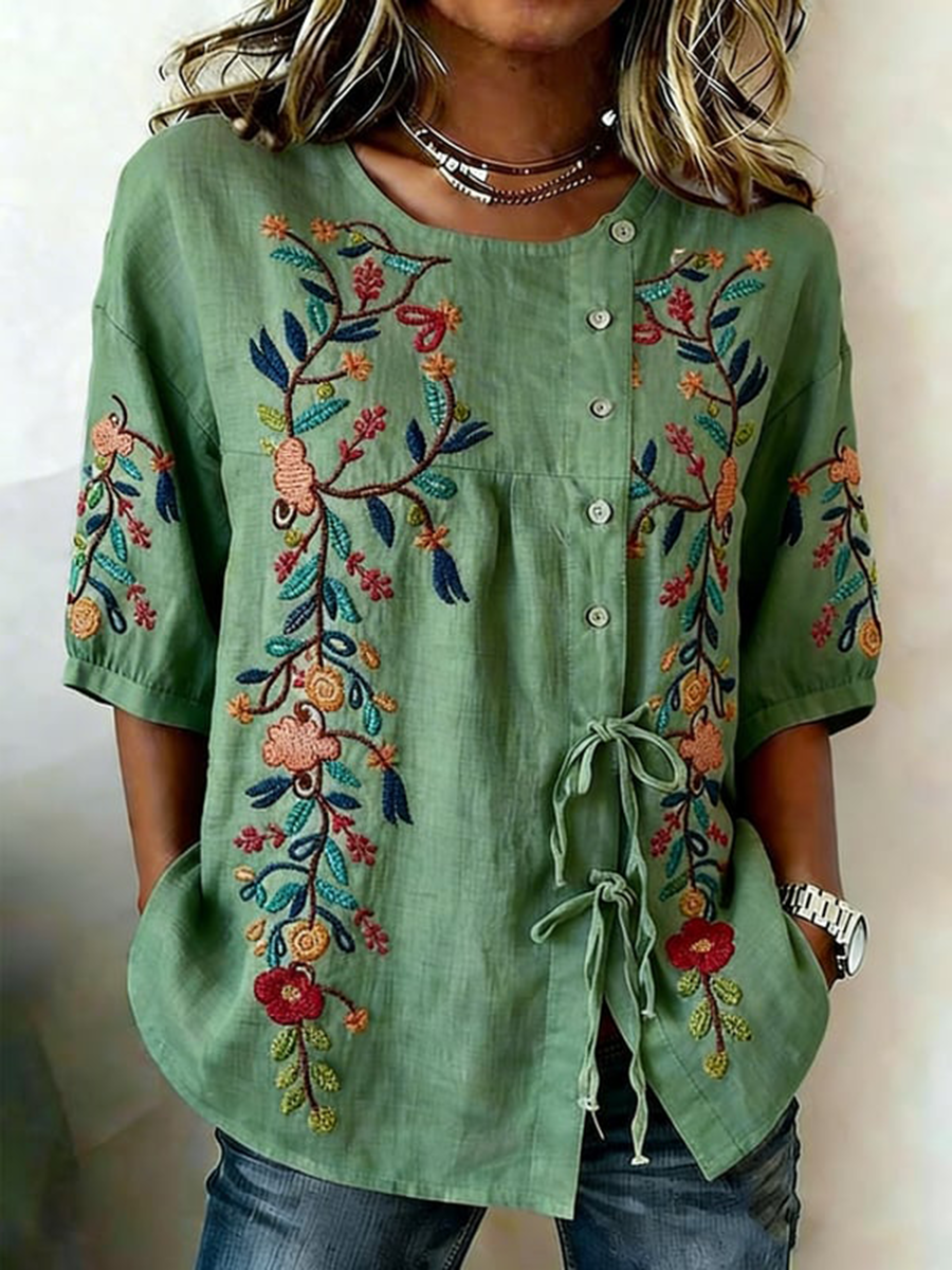 Women's Plants And Flowers Buttoned And Laced Linen Blend Shirt