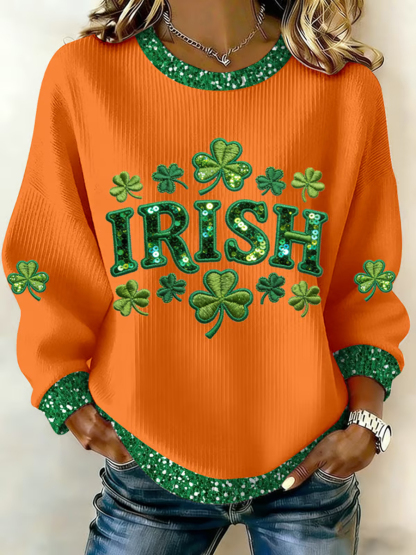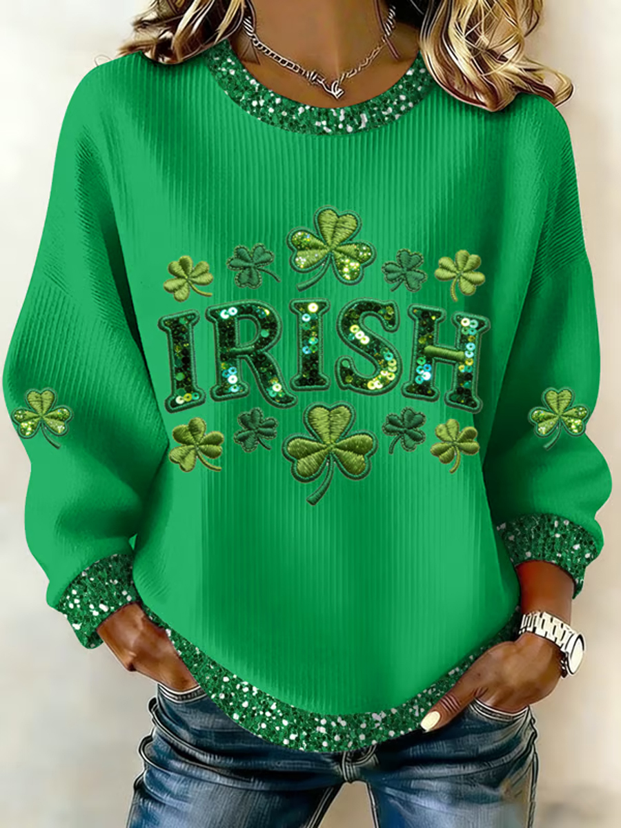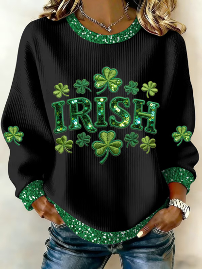 Women's St Patrick's Day Shamrock Ribbed Round-Neck Sweatshirt