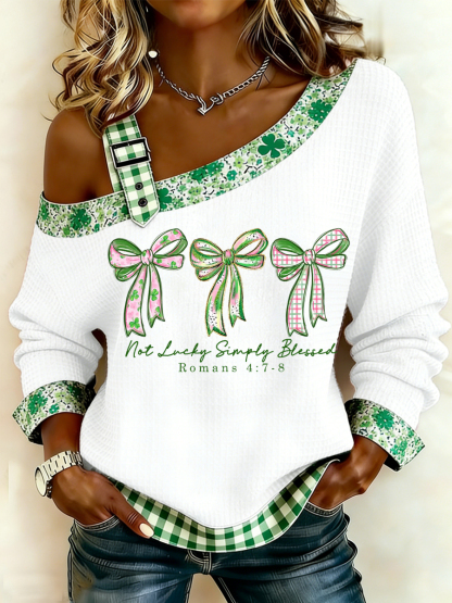 Women's St. Patrick's Day Not Lucky Simply Blessed Print Casual Waffle Off-Shoulder Top