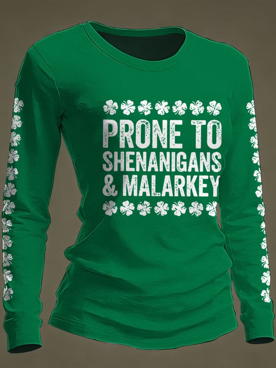Women's St. Patrick's Day Prone To Shenanigans And Malarkey Shamrock Print Casual Long-Sleeve T-Shirt