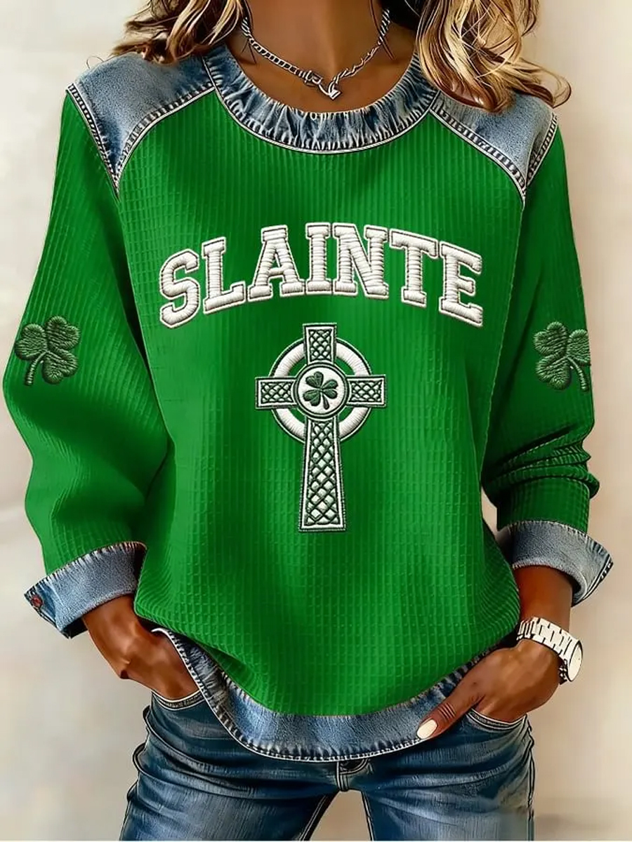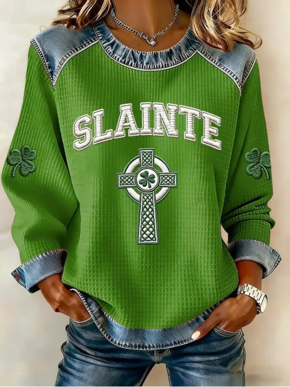 Women's St. Patrick's Day Sláinte Celtic Knot Shamrock Print Waffle Patchwork Top