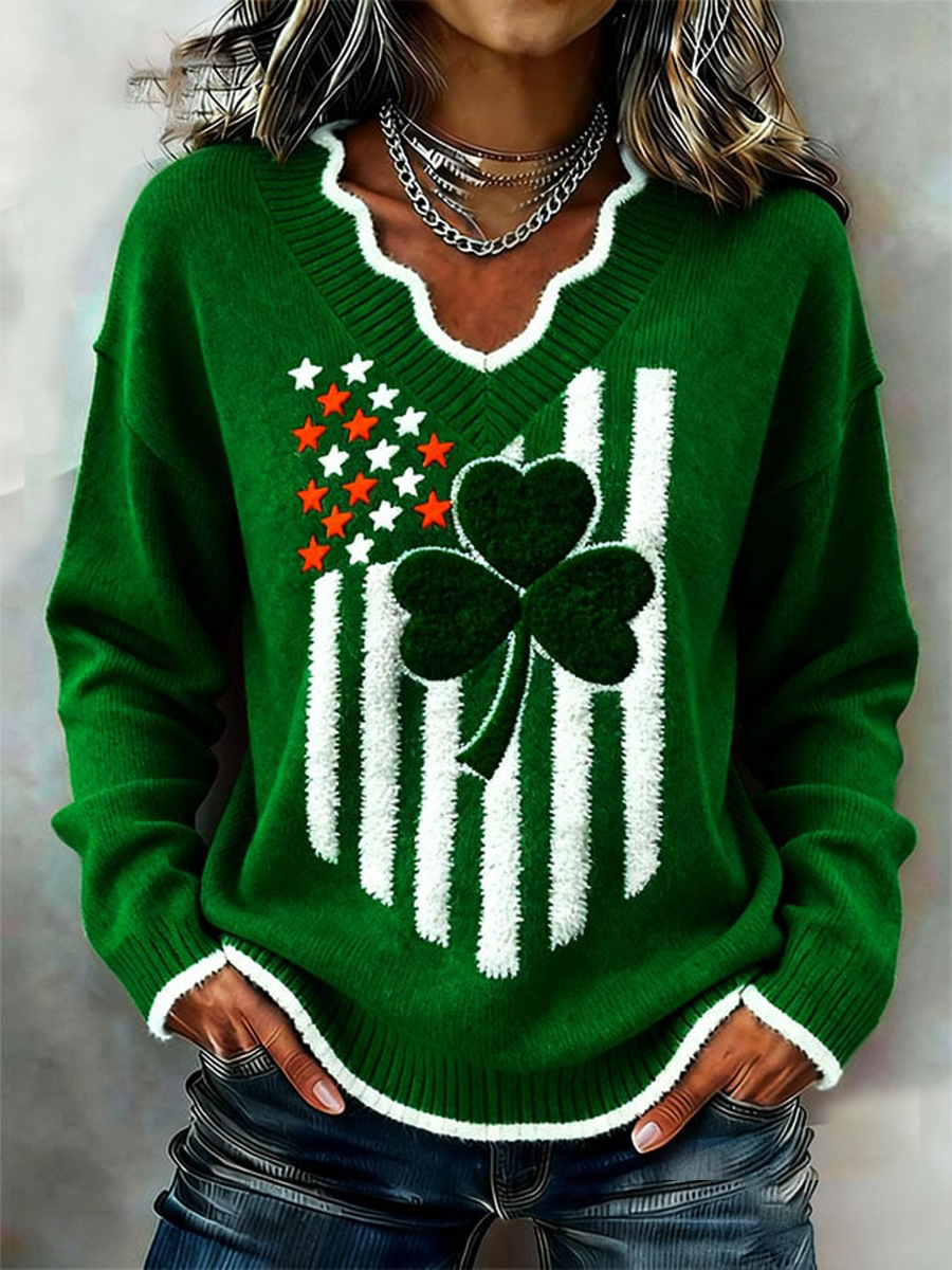 Women's St. Patrick's Day V-Neck Clover Sweater