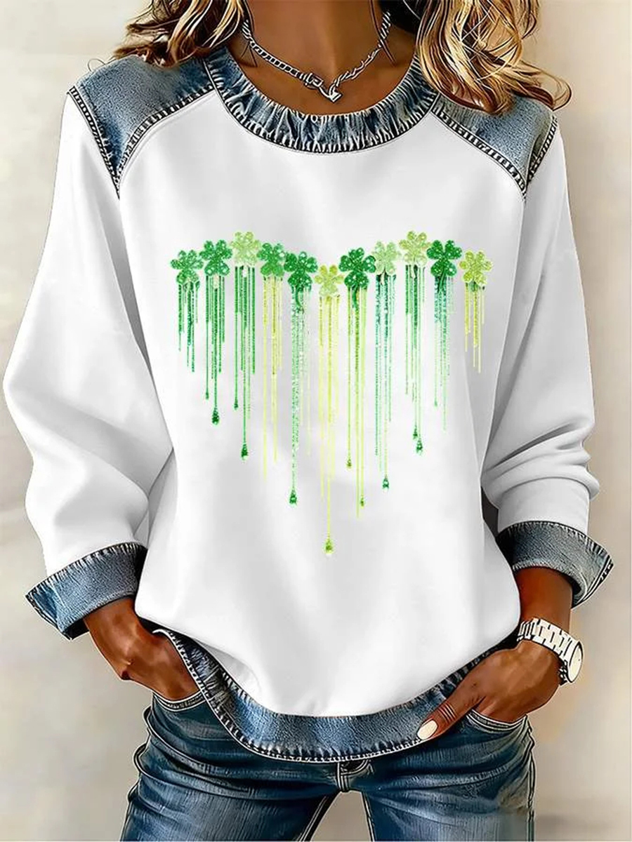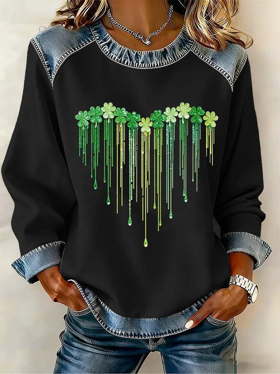 Women's St. Patrick's Day waffle-knit denim collar sweatshirt