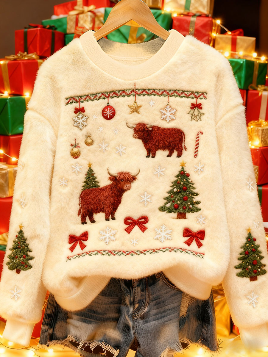 Women's Vintage Christmas Highland Cattle Printed Flannel Sweatshirt