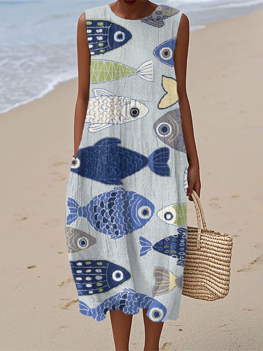 Women's Vintage Fish Art Print Linen Dress