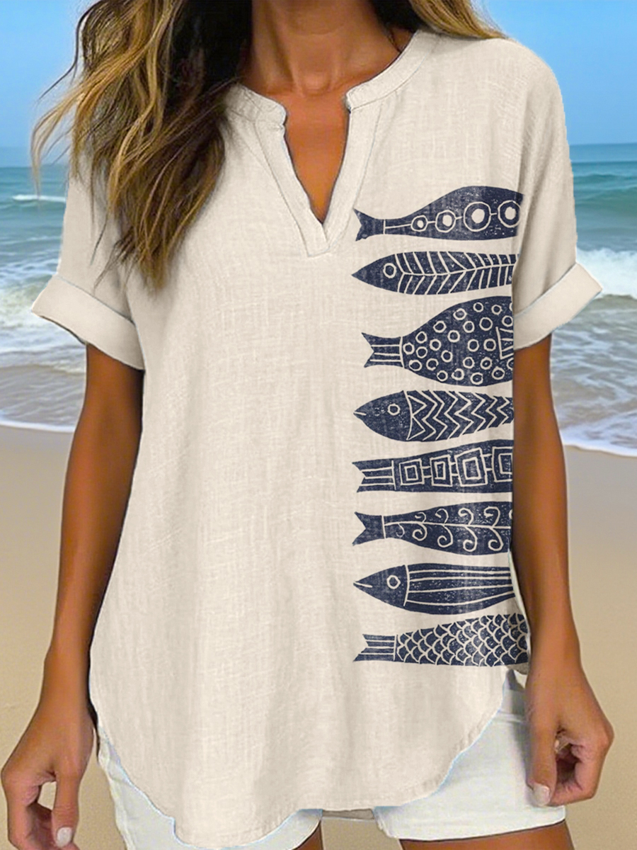 Women's Vintage Fish Art Print Linen Shirt