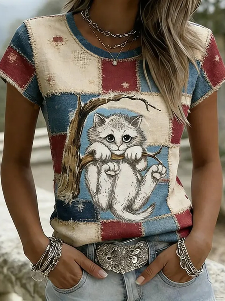 Women's Vintage Opalite Kitten In Tree With Patchwork Art Short-sleeved T-shirt