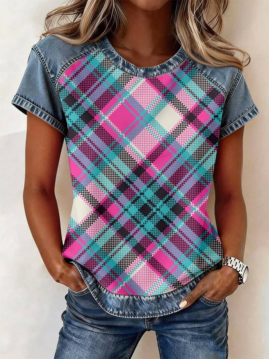Women's Vintage Plaid Print Denim Patchwork Top