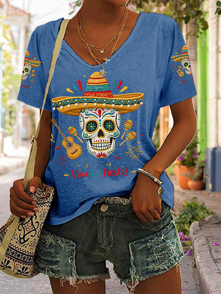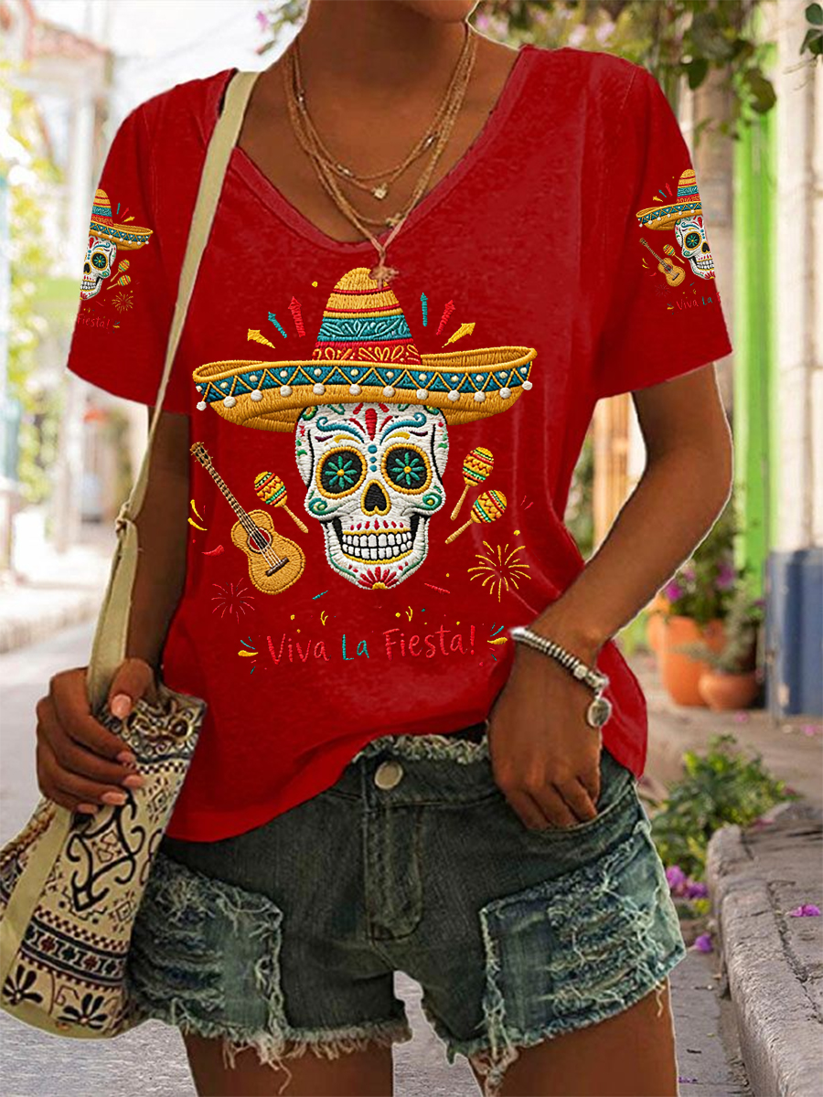 Women's Viva La Fiesta! Print Casual V-Neck Tee